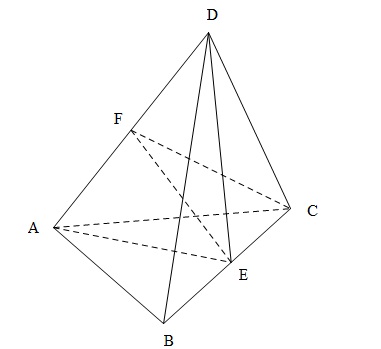 Cho tứ diện $ABCD$, trong đó \(BC = a,\,AB = AC = b,\,DB = DC = c,\,\,\alpha \) là góc phẳng nhị diện cạnh \(BC\left( {\alpha < \frac{\pi }{2}} \right)\). Với điều kiện nào đối với $b, c$ đường thẳng nối điểm giữa $E$ của $BC$ với điểm $F$ của $AD$ là đường vuông góc chung của $BC$ và $AD$. Với điều kiện vừa tìm được, hãy chứng minh hình cầu đường kính $CD$ đi qua $E, F$ và tính thể tích tứ diện đã cho