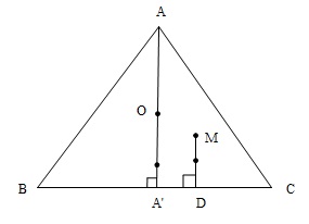 Cách $2$ Gọi $AA', BB', CC'$ là các đường cao của tam giác $ABC$. Đặt : $S\left( {MBC} \right) = {S_a},S\left( {MCA} \right) = {S_b},S\left( {MAB} \right) = {S_c}$. ta có : ${S_a}\overrightarrow {MA} + {S_b}\overrightarrow {MB} + {S_c}\overrightarrow {MC} = \overrightarrow 0 \,\,\,\,\,\,\,(1)$ Mặt khác : $\overrightarrow {MD} = \frac{{MD}}{{{\rm{AA}}'}}.\overrightarrow {AA'} = \frac{{{S_a}}}{S}\overrightarrow {AA'} = \frac{3}{2}\frac{{{S_a}}}{S}\overrightarrow {AO} (S = S\left( {ABC} \right))$ Tương tự như vậy : $\overrightarrow {ME} = \frac{3}{2}.\frac{{{S_b}}}{S}\overrightarrow {BO} ;\,\,\,\,\overrightarrow {MF} = \frac{3}{2}.\frac{{{S_c}}}{S}\overrightarrow {CO} $ Từ đó suy ra : $\begin{array}{l} \overrightarrow {MD} + \overrightarrow {ME} + \overrightarrow {MF} = \frac{3}{{2S}}\left( {{S_a}\overrightarrow {AO} + {S_b}\overrightarrow {BO} + {S_c}\overrightarrow {CO} } \right)\\ = \frac{3}{{2S}}.\left[ {{S_a}\left( {\overrightarrow {MO} - \overrightarrow {MA} } \right) + {S_b}\left( {\overrightarrow {MO} - \overrightarrow {MB} } \right) + {S_c}\left( {\overrightarrow {MO} - \overrightarrow {MC} } \right)} \right]\\ = \frac{3}{{2S}}\left( {{S_a} + {S_b} + {S_c}} \right)\overrightarrow {MO} - \frac{3}{{2S}}\left( {{S_a}\overrightarrow {MA} + {S_b}\overrightarrow {MB} + {S_c}\overrightarrow {MC} } \right) \end{array}$ $ = \frac{3}{{2S}}.S.\overrightarrow {MO} $ $ = \frac{3}{2}\overrightarrow {MO} $ (đpcm)