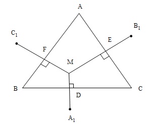 Gọi $D, E, F$ là giao điểm của $M{A_1},M{B_1},M{C_1}$ với các cạnh $BC,CA,AB$; $O$ là trọng tâm $\Delta ABC$. Ta có : $\begin{array}{l} \overrightarrow {M{A_1}} + \overrightarrow {M{B_1}} + \overrightarrow {M{C_1}} \\ = 2\left( {\overrightarrow {MD} + \overrightarrow {ME} + \overrightarrow {MF} } \right)\\ = 2.\frac{3}{2}\overrightarrow {MO} \,\,\,\,(*)\\ = 3\overrightarrow {MO} \end{array}$ Điều này chứng tỏ $O$ cũng là trọng tâm của $\Delta {A_1}{B_1}{C_1}$