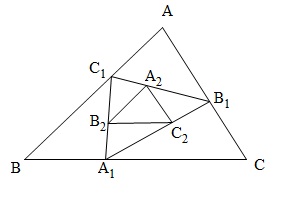 Trên các cạnh $BC,CA,AB$ của tam giác $ABC$ lấy lần lượt các điểm ${A_1},{B_1},{C_1}$ sao cho $\frac{{{A_1}B}}{{{A_1}C}} = \frac{{{B_1}C}}{{{B_1}A}} = \frac{{{C_1}A}}{{{C_1}B}} = k > 0$. Trên các cạnh ${B_1}{C_1},{C_1}{A_1},{A_1}{B_1}$lấy lần lượt các điểm ${A_2},{B_2},{C_2}$ sao cho $\frac{{{A_2}{B_1}}}{{{A_2}{C_1}}} = \frac{{{B_2}{C_1}}}{{{B_2}{A_1}}} = \frac{{{C_2}{A_1}}}{{{C_2}{B_1}}} = \frac{1}{k}$