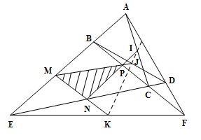 Áp dụng định lí Mênêlauyt cho tam giác $MNP$ ta có $I,J,K$ thẳng hàng.