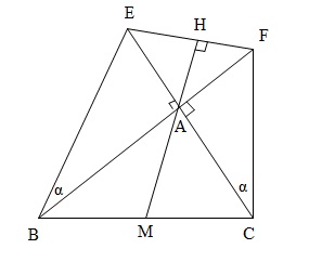 Cho tam giác $ABC$. Dựng về phía ngoài các tam giác vuông đồng dạng $ABE$ và $ACF$. $\left( {\widehat {BAE} = \widehat {CAF} = 1v} \right)$. Chứng minh trung tuyến $AM$ vuông góc với $EF$.