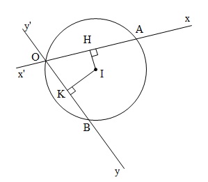 Gọi $I$ là tâm đường tròn $\left( {OAB} \right);\overrightarrow {{e_1}} ,\overrightarrow {{e_2}} $ là các vecto đơn vị của $x'{\rm{Ox}},y'Oy$; $H$ và $K$ là hình chiếu của $I$ trên $x'{\rm{Ox}},y'Oy$.