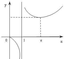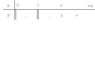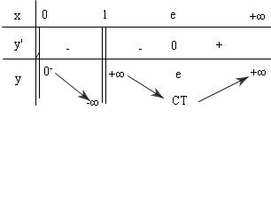 Hàm số đạt cực tiểu tại điểm $\left\{ \begin{array}{l} x = e\\ {y_{CT}} = e \end{array} \right.$ $\mathop {\lim }\limits_{x \to {0^ + }} y = {0^ - },\,\,\,\,\mathop {\lim }\limits_{x \to 1} y = \pm \infty \,\,\, \Rightarrow $ đường $x = 1$là tiệm cận đứng $\mathop {\lim }\limits_{x \to + \infty } y = + \infty $ Bảng biến thiên:  Đồ thị :
