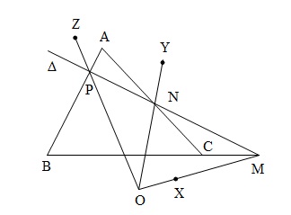 Cho tam giác $ABC$, đường thẳng $\Delta $ cắt $BC, CA, AB$ tại $M, N, P; O$ là điểm không thuộc đường thẳng $\Delta $. Các đường thẳng $OM, ON, OP$ cắt đường tròn ngoại tiếp các tam giác $OBC, OCA, OAB$ tại $X, Y, Z$ (khác $O$). Chứng minh rằng bốn điếm $O, X, Y, Z$ cùng thuộc một đường tròn.