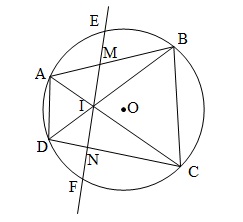 Cho tứ giác $ABCD$ nội tiếp đường tròn $(O)$. $AC \cap BD = I$. Một đường thẳng qua $I$, cắt các đoạn $AB, CD$ lần lượt tại $M, N$ cắt $(O)$ tại $E, F$ $\left( EM < EN < EF \right)$. Chứng minh rằng: $\frac{1}{IE} + \frac{1}{IN} = \frac{1}{IF} + \frac{1}{IM}$