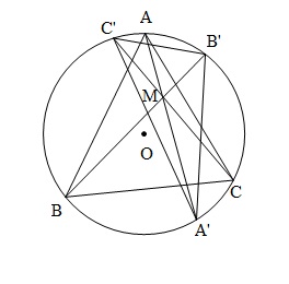 Cho tam giác $ABC$, nội tiếp đường tròn $(O;R)$. $M$ là một điểm không nằm trên $(O); MA, MB, MC$ cắt $(O)$ tại $A',B',C'$. Chứng minh rằng: