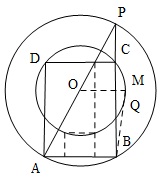 Đường thẳng $BC$ cắt đường tròn bán kính $R$ tại $P$ và đường tròn bán kính $r$ tại $Q$, lúc đó $BQ=CP$. Gọi cạnh hình vuông là $x$ và tiếp tuyến với đường tròn bán kính $r$ đi qua $B$ và $M$, ta có: