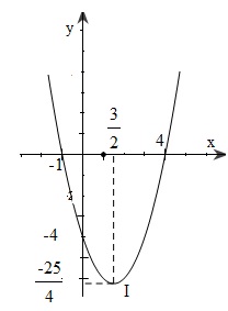 Ta có: $a=1>0, -\frac{b}{2a}=\frac{3}{2}, -\frac{\Delta}{4a}=-\frac{25}{4}$. Vậy đồ thị hàm số $y=x^2-3x-4$ là parabol có đỉnh $I(\frac{3}{2};-\frac{25}{4})$, nhận đường thẳng $x=\frac{3}{2}$ làm tâm đối xứng và bề lõm hướng lên trên.