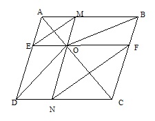 Cho hình bình hành $ABCD$. Gọi $O$ là một điểm bất kỳ trên đường chéo $AC$. Qua $O$ kẻ các đường thẳng song song với các cạnh của hình bình hành. Các đường thẳng này cắt $AB$ và $DC$ lần lượt tại $M$ và $N$, cắt $AD$ và $BC$ lần lượt tại $E$ và $F$. Chứng minh rằng: