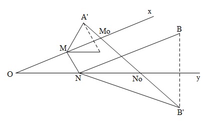 Do đó $AM+MN+NB=A'M+MN+N'B$ . Đường gấp khúc $A'M+MN+NB'$ với $A', B'$ có độ dài ngắn nhất. Khi $A', M, N, B'$ thằng hàng. Vậy $M\equiv Mo= A'B' cắt Ox, N\equiv No=A'B' cắt Oy$ .